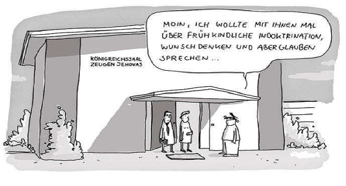 Lies bitte hier nur weiter, wenn Deine mentalen Nervenbahnen mit den sensorischen Eingangsmustern der nun folgenden Spezies "Zeugen Jehovas" klarkommen. Um es mit den Worten eines mir bekannten Androiden auszudrücken. Die Zeugen Jehovas sind eine missionarische, sich offiziell als christliche Glaubensgemeinschaft darstellende Bruderschaft, die mit der Welt und sich selbst unzufrieden sind, weswegen Sie versuchen, die Gesellschaft, zu der sie sich berufen fühlen durch Anwerben neuer Mitglieder zu vergrößern. Als mittelfristiges Ziel haben sie sich gesetzt, möglichst viele Anhänger ihrer Lehre zu gewinnen. Dazu wandern sie von Tür zu Tür und stehen gegen 7 Uhr morgens vor Haustüren, klingeln Sturm und lassen ein lautes "Erwachet!" ertönen, wobei auch der größte Schläfer vor Schreck aus dem Bett gefallen sein sollte. "Ja, ich bin erwacht". Ich renne also wutentbrannt zur Türe und sehe zwei viel zu gut gelaunte, freundlich lächelnde Menschen vor sich, die entweder wie Jesus persönlich oder einfach nur Scheiße aussehen. "Wir haben dir eine Botschaft zu überbringen, Fremder", spricht eine hypnotisch anmutende Stimme in geheimnisvollem Singsang. "Eine Botschaft von unserem Herrn.". Meine Erwiderung "Meint ihr damit die GEZ?" wird zumeist ignoriert. Dies ist in etwa so sinnlos wie das Schlagen eines Masochisten mit der Absicht, ihn loszuwerden. Böse Zungen behaupten, dass einige Mitglieder nur deswegen Jehovas Zeugen beigetreten sind, um Ihr Hobby zum Beruf zu machen: durch die Stadt latschen und hübschen Frauen ihre Telefonnummern abknöpfen. Beim folgenden Treffen ist es dann der Zeugen geheiligtes Ziel, diese Frauen "dem Himmelreich näher zu bringen", was auch immer man darunter versteht. Die Wege des Herrn sind eben unergründlich. Verboten sind den Zeugen Jehovas Sex vor der Ehe, Bluttransfusionen und der Konsum von Alkohol sowie das Gebrauchen von Logik und gesundem Menschenverstand. Jehova lehrt, keine Waffen zu tragen und sich nicht zu verteidigen, denn Gott wird dazwischen gehen; deshalb empfiehlt es sich nicht, für Paintball-Matches einen Zeugen Jehovas einzuladen Wenn Du also der Sünden müde bist tritt in die Kirche ein ! Wenn nicht, so rufe 687733 an.