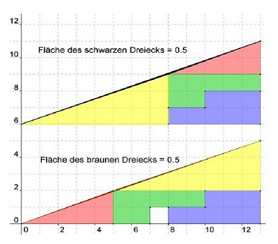 Trick liegt darin, dass das rote und blaue Dreieck nur scheinbar ähnlich